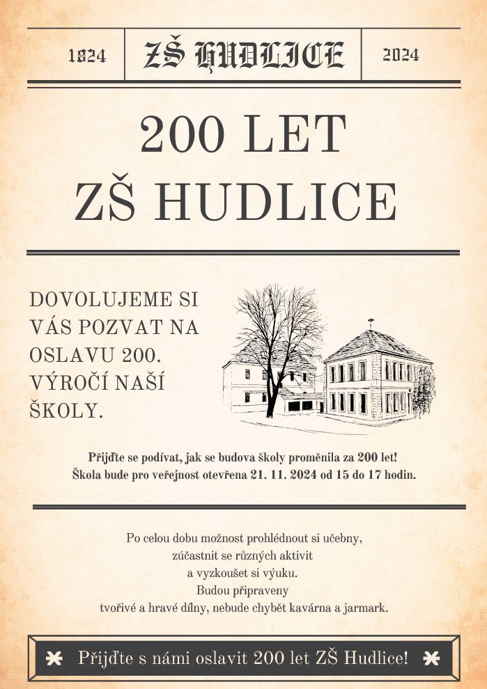 Pozvánka na oslavu 200. výročí školy v Hudlicích. 6. 11. 2024 Záhrubská Pozvánka na oslavu 200. výročí školy v Hudlicích.